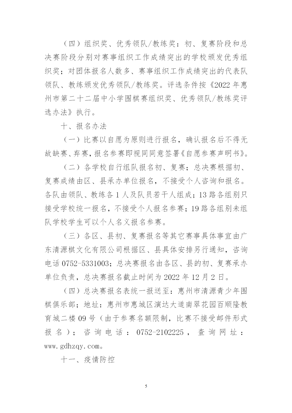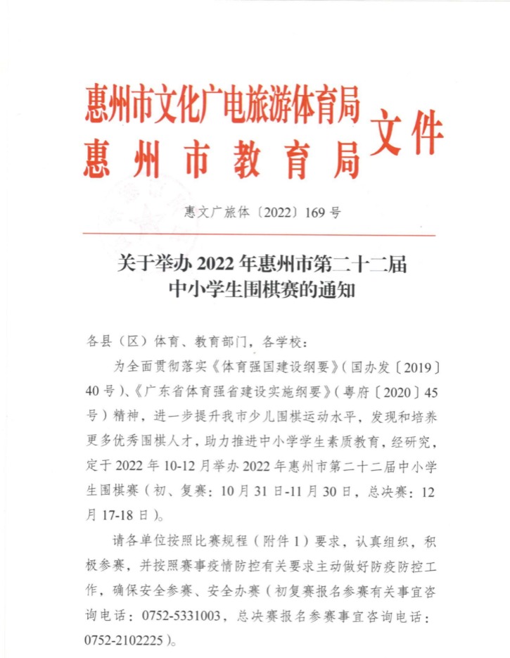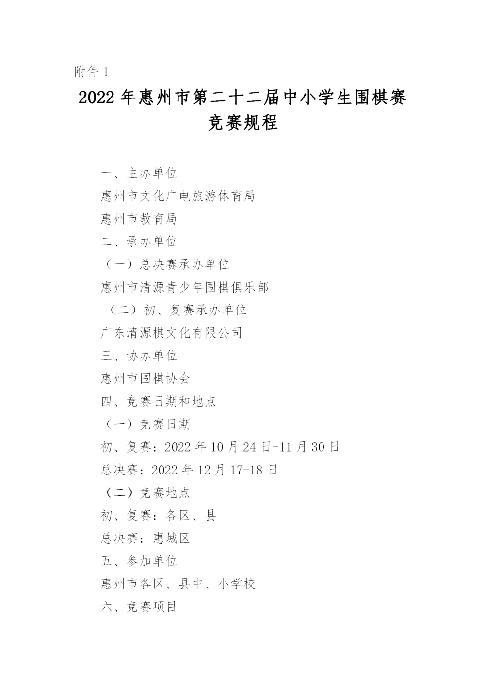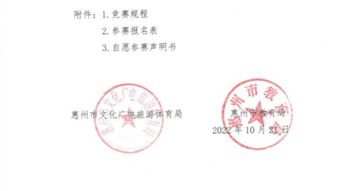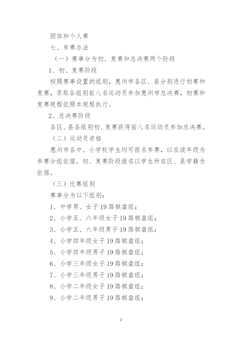 按照賽事設置的組別,惠州市各區、縣分別進行初賽和復賽,錄取各組別前八名運動員參加惠州市總決賽,初賽和復賽規程依照規程執行。