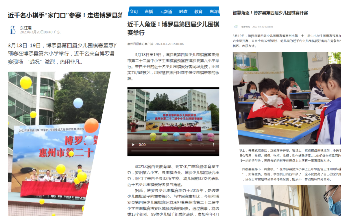 這場舉辦在博羅“家門口”的專業、正規、大型的圍棋賽事,是由博羅縣教育局、博羅縣文化廣電旅游體育局主辦,影響力大、權威性強,備受社會各界矚目。除羅陽街道各學校、幼兒園外,博東、園洲、石灣、楊村、長寧、柏塘、橫河等鎮區均有校園組隊參賽,賽事覆蓋面在惠州各區、縣的圍棋賽事中首屈一指。吸引了騰訊新聞、博羅電視臺、惠州日報、今日頭條等惠州多家主流媒體紛紛到現場進行采訪報道。