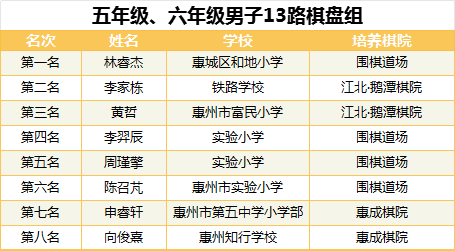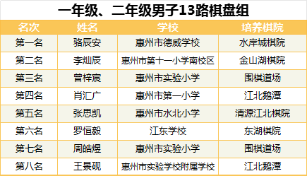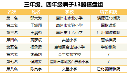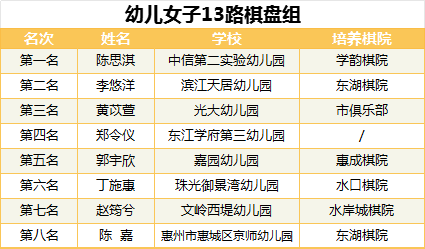 經過一天5-6輪的激烈角逐,最終來自藍迪幼兒園葉仲笙、中信第二實驗幼兒園陳思淇、惠州市德威學校駱辰安、惠州市第十一小學陳奕霏、惠州市水北小學邵大為、惠州市實驗小學黎思齊、惠城區和地小學林睿杰、第五中學小學部鐘星八位小棋手斬獲各組別冠軍,共計59位小棋手榮獲個人獎項。