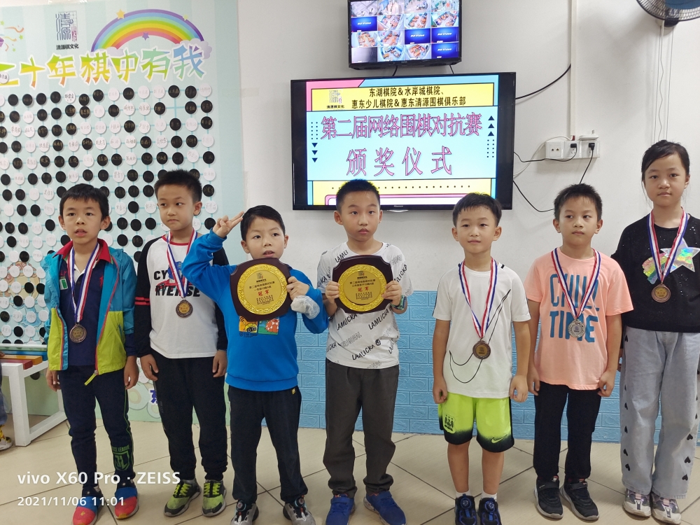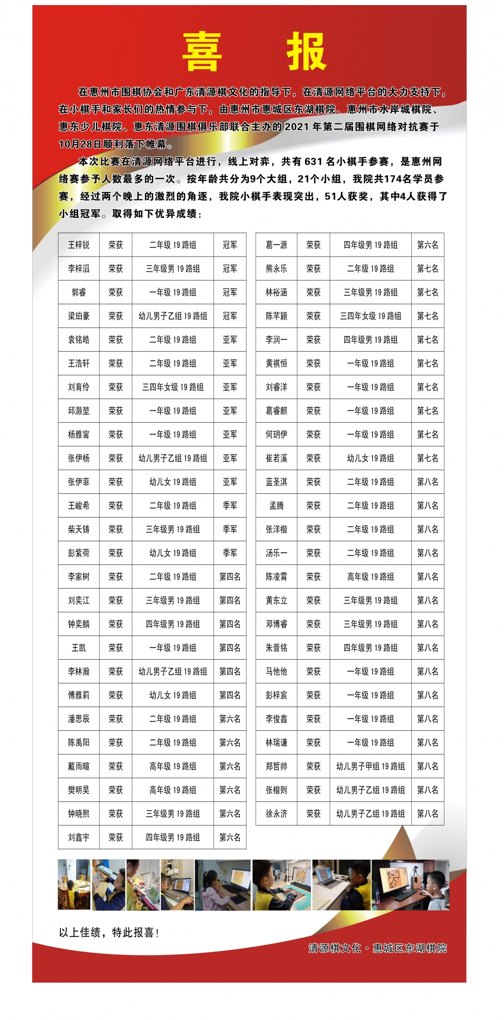 2021年第二屆圍棋網(wǎng)絡(luò)對抗賽于10月28日圓滿落下帷幕。此賽事由惠州市惠城區(qū)東湖棋院、惠州市水岸城棋院、惠東少兒棋院、惠東清源圍棋俱樂部聯(lián)合主辦。 對 弈 本次比賽在清源網(wǎng)絡(luò)平臺進行,線上對弈,共有631名小棋手參賽,是惠州網(wǎng)絡(luò)賽參與人數(shù)最多的一次。經(jīng)過兩個晚上激烈的角逐,小棋手們表現(xiàn)突出,取得如下優(yōu)異成績: 頒獎儀式 恭喜所有獲獎的小棋手,希望你們能夠在下次比賽中再創(chuàng)佳績,在更為廣闊的圍棋新天地上嶄露鋒芒!在此,感謝各位領(lǐng)導(dǎo)、教練以及家長們的大力支持,期待小棋手下次比賽的精彩表現(xiàn)吧!